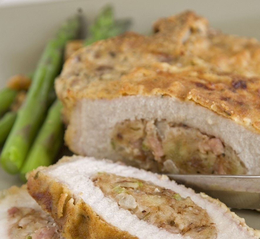 Stuffed Pork Chops with Asparagus and Pecan Sauce